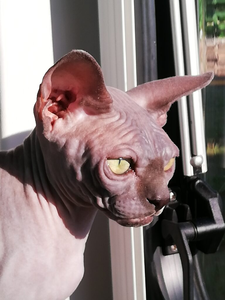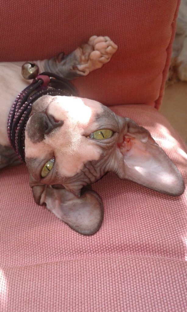 Glups était un mâle sphynx bleu solide avec une peau douce et brillante.