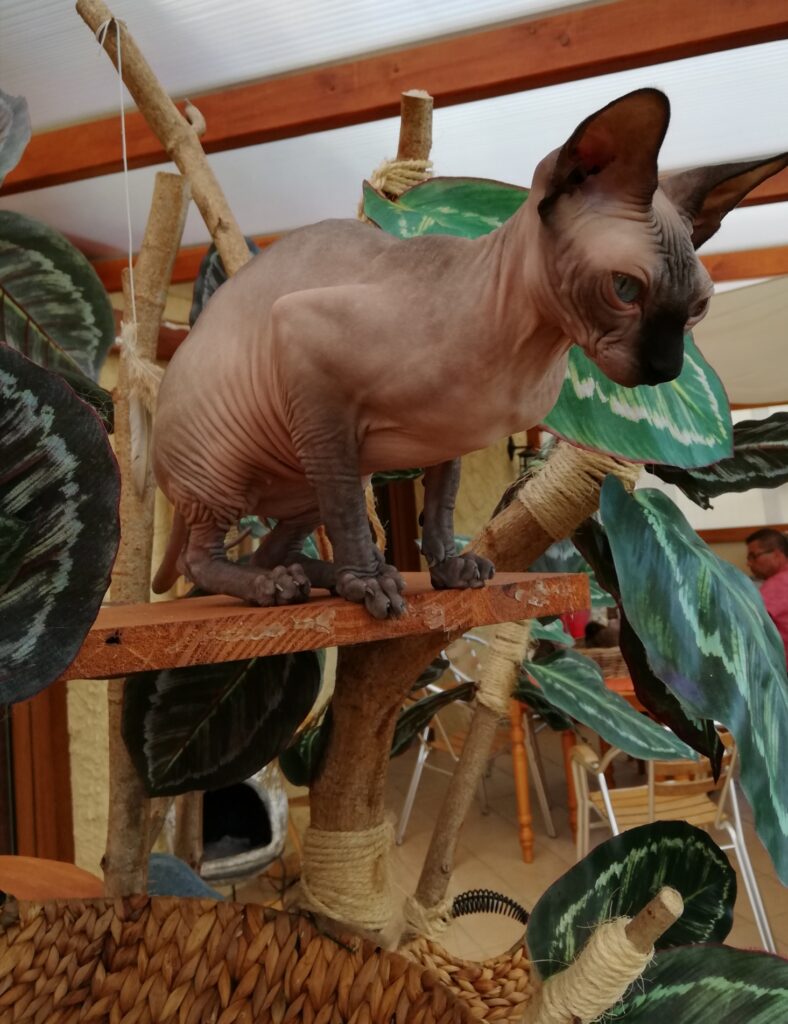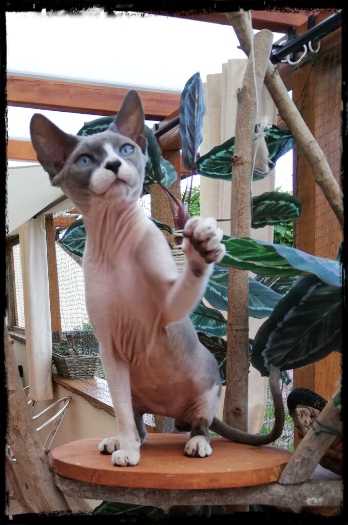 Nexton est un mâle sphynx bleu et blanc à peau de pêche.